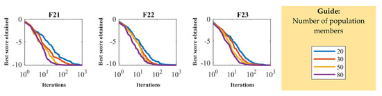 In order to analyze the sensitivity of the proposed algorithm to the number of population members parameter, the GMBO was run independently on all 23 objective functions for the different populations with the number of 20, 30, 50, and 80 members. The results of this simulation for different numbers of population members are presented in Table 6. It is analyzed from Table 6 that for the proposed GMBO, the value of objective function decreases when the number of search agents increases. Convergence curves of GMBO for the sensitivity analysis of the number of population members are shown in Figure 3.
