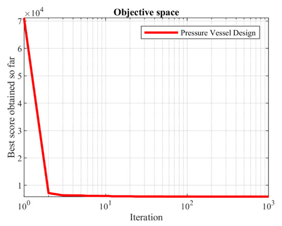 The mathematical model of this problem was adapted from [22]. Figure 5 shows the schematic view of the pressure vessel problem. Table 8 and Table 9 report the performance of the GMBO and other algorithms. The GMBO provides an optimal solution at (0.778201, 0.384739, 40.320910, 200.00000), with a corresponding objective function value of 5886.0424. Figure 6 presents the convergence analysis of the GMBO for the pressure vessel design optimization problem.
