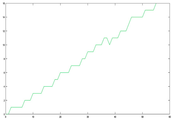 Then, according to the previous analysis, one expects that will continually be evaluated with a larger number of erroneous decimal digits (e. d. d.), as grows. To verify/demonstrate that, we have employed , we have generated sequence of the powers of by means of the aforementioned sequence of successive multiplications and we have evaluated the exact number of e. d. d. with which is calculated each time; the determination of the exact number of erroneous d. d. has been made as described in Section 5 and Section 6, using decimal digits word length and decimal digits precision. The associated results are depicted in Figure 4, from which it is evident that after the impressively small number of 55 iterations, the power is computed with all its digits erroneous.