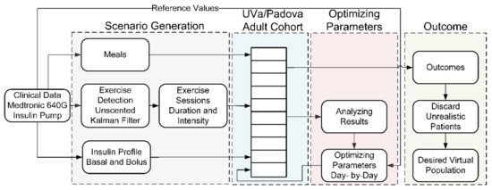 To address current downfalls of VP populations in simulators, several methodologies to generate larger cohorts of T1D VPs have been developed. Haider et al. [50] proposed a probabilistic method for the generation of virtual subjects. Clinical data from 12 young T1D patients was used to test the methodology. Resalat et al. [4] proposed a statistical method to generate a population of T1D VPs mainly based on variants of the Hovorka model. The selection criterion of VP was based on clinical data from 20 patients undergoing artificial pancreas (AP) trials. The parameters used for comparison were percent of time (PoT) in normoglycemia (BG in 70 to 180 mg/dL), hyperglycemia (BG > 180 mg/dL), and hypoglycemia (BG < 70 mg/dL). Orozco-Lopez et al. [51] proposed a methodology to generate a large cohort of VPs. An already available cohort in the OHSU simulator was utilized to generate more VPs by establishing a relationship between the subject’s parameters in terms of covariance illustrated in the Hovorka model.