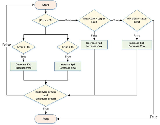 The flow chart of the algorithm is presented in Figure 2, which is adopted for the optimization of parameters corresponding to each day. The description of parameters used in the flow chart can be seen in Table 3. The parameters are incremented or decremented in order to minimize the error (see Table 3). The parameters are subjected to maximum and minimum limits constraints. A threshold of 0.5 mg/dL is considered for the acceptable error in median BG. Once this threshold is met, the values of the parameters are selected for that particular day.