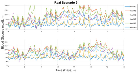 The original inter-patient variability provided by the UVa/Padova cohort is retained for the newly generated VPs. To demonstrate this, a scenario of three meals per day for a duration of 14 days, which is the maximum length of simulation considered in this study, was used to analyze the inter-subject variability. The breakfast (45 g), lunch (70 g), and dinner (60 g) were delivered at 7:00, 13:00, and 20:00, respectively. Open loop insulin therapy was used for simulations with adjusted basal rates for the generated VPs. The results for real scenario 9 (see Table 2) are presented in Figure 3. The simulation results of all real scenarios are provided as Supplementary Materials (Figures S1–S11). The results for real scenarios 5 and 7 are not included because they were composed of only 1 acceptable VP.