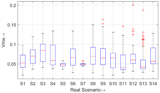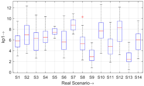 The distinct realistic scenarios considered are reflected in a set of optimized parameters which are significantly different. To illustrate this, box plots of the parameters ( and ) are presented in Figure 5 and Figure 6, respectively. The values of all parameters for 75 VPs are provided in the Supplementary Materials.
