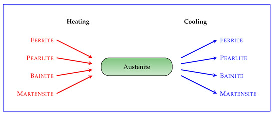 When the cooling rate is high enough, the austenite is transformed into martensite, which is the hardest microconstituent of steel. On the other hand, if the cooling rate is not big enough, the austenite is transformed back into the other phases, i.e., ferrite, pearlite, and bainite (Figure 2) possibly along with a different partition.