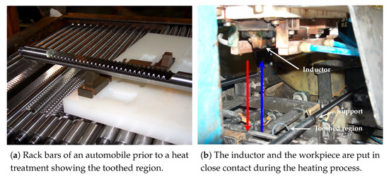 There exist several industrial hardening procedure of steel: induction-conduction, flame, electron beam, laser surface, and so on (see [1,2,3]). For our purposes, we are concerned with an induction-conduction process. A conductor (coil) carries a high frequency alternating current producing a changing magnetic field and in its turn inducing eddy currents. As a result, induction heating takes place: the heat so generated (Joule’s heating) affects only the outer surface of steel components due to the skin effect. The current passing the workpiece is switched on usually for a few seconds only. When austenitization is reached, the electric current is then switched off and the workpiece is subsequently quenched in order to obtain the necessary cooling down temperature rate.