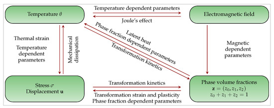 In the next section we describe the mathematical modeling of both the heating and the cooling industrial processes for the hardening of a rack bar. The governing equations is a nonlinear strongly coupled system of PDEs/ODEs. Figure 4 explains the way this whole system is strongly coupled concerning the electromagnetic quantities, the phase fractions, stresses, displacement field and temperature as well. Since a high alternating electric current (83 KHz in this setting) is applied, potential Maxwell’s equations in the harmonic regime are used to describe the electromagnetic induction. The main production term responsible for the increase in temperature along the critical part of the workpiece (the toothed region) is Joule’s heating coming from the eddy currents induced by the applied high alternating electric current. Additionally, we focus our attention on two solid steel phase fractions, namely austenite during the heating and cooling stages, and martensite during the cooling stage. The dynamics of these two phase fractions are described by a set of two ODEs. High temperature changes and phase transformations are accompanied by deformations. In order to deal with these mechanical effects, a quasistatic viscoelasticity model is considered. Here, the main quantities of interest are the Cauchy stress tensor, the strain tensor and the displacement field. Finally, a balance law of internal energy is taken into account. The source terms include Joule’s heating, mechanical dissipation and latent heat.