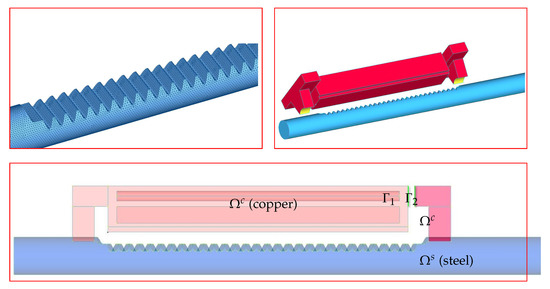 Let , be an open set with a Lipschitz-continuous boundary (see Figure 5). . and stand for the inductor (copper-made) and the steel rack bar, respectively. is the contact surface between the two conductors. We consider two opposite faces as shown in Figure 5 where the potential difference is applied. We also put .