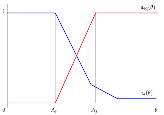 Herein, stands for the Heaviside function if and is zero elsewhere. The functions , (see Figure 6) can be determined from experimental data.
