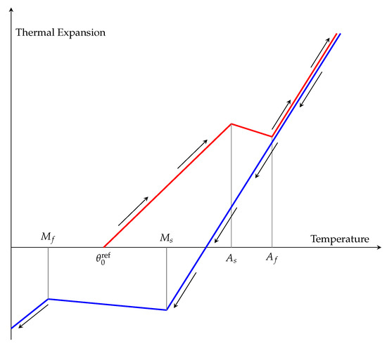 - is a thermal contribution to strain, deduced from available dilatometry experiments (see Figure 7). As long as the temperature is increasing, the material expansion is modeled using a linear fitting. During the transformation into the austenite phase, a contraction range can be observed before going on with the usual expansion, but now with a higher linear coefficient.
