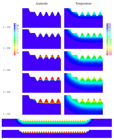 Above: austenite and temperature during the heating stage at , 2.0, 3.0, 4.0 and 5.5 s, respectively. Center: temperature distribution along the full toothed region. Below: austenite phase fraction distribution at the final heating stage along the full toothed region. It can be seen that every tooth has been austenized while, except for a very thin transition strip, the rest of the workpiece remains unchanged.