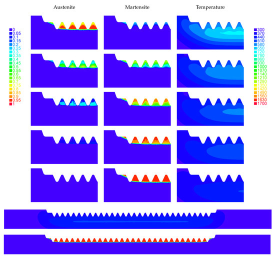 Above: austenite, martensite and temperature during the cooling stage at , , , and s, respectively. Center: temperature distribution at the final cooling stage along the full toothed region. Below: martensite phase fraction distribution at the final cooling stage along the full toothed region. These results show the whole transformation of the austenite into martensite along the toothed region.