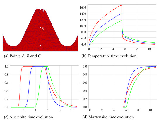 Austenite, martensite and temperature time evolution at points A (red line), B (blue line) and C (green line).