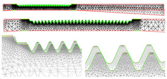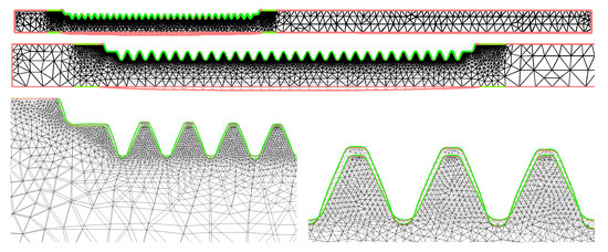 In Figure 8, some pictures are displayed for the meshes used in our 2D numerical simulations. It is important to have a high density of triangles close to the toothed region. The material parameters have been taken from data of a specific steel with a given composition (Table 1) assuring the desirable mechanical properties after the heat treating [21]. In Table 2 we can find the actual values we have taken in our numerical experiments. The parameters in the thermal stresses modeling has been taken from [22,23].