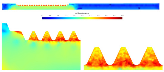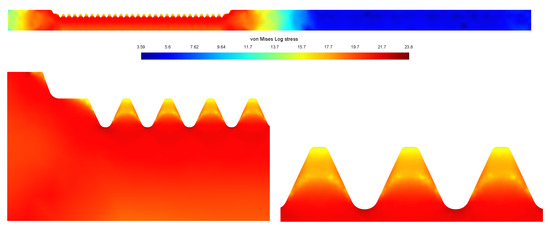 Distribution of the (natural logarithm of) von Mises stresses at the end of heating stage. The workpiece is highly stressed near the toothed line.