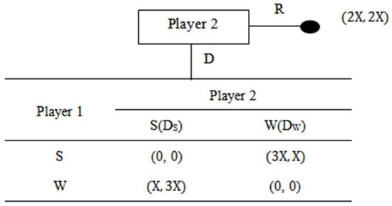 As shown in Figure 1, game player 2 makes decisions first, and has two strategies: R and D. If R is selected, both sides get 2X units of benefits, and then the game ends. If D is selected, the game enters the second stage, and the two sides make decisions simultaneously, and both sides have two strategies: S and W. When both sides choose S or W at the same time, the benefits of both sides are 0. When player 1 chooses W and player 2 chooses S, player 1 obtains X units of benefits and player 2 obtains 3X units of benefits. When player 1 chooses S and player 2 chooses W, player 1 obtains 3X units of benefits and player 2 obtains X units of benefits. The above game contains two types of interest conflicts: (1) when the two sides have complementary strategies, that is, one side shows strength and the other side shows weakness, distribution result (3X, X) or (X, 3X) may appear; (2) when the two sides have a competitive strategy, that is, when both sides show strength or weakness, distribution result (0, 0) may appear.