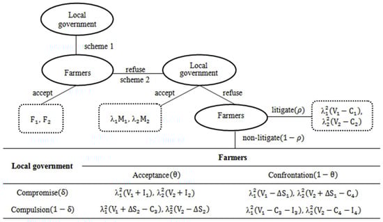 According to the strategic choices of both sides in the game, there are four possible strategy combinations: when the local government chooses compromise and farmers choose acceptance, the local government’s income is and the farmers’ income is , satisfying , where and represent the positive externality benefits obtained by the local government and farmers, respectively. When the local government chooses compromise and farmers choose confrontation, the local government’s income is and the farmers’ income is , satisfying and , where represents the excess income obtained by the farmers and represents the struggle cost of the farmers. When the local government chooses compulsion and farmers choose acceptance, the local government’s income is and the farmers’ income is , satisfying and , where represents the excess income obtained by the local government and represents the struggle cost of the local government. When the local government chooses compulsion and farmers choose confrontation, the local government’s income is and the farmers’ income is , satisfying , where and represent the negative external losses borne by the local government and farmers, respectively.