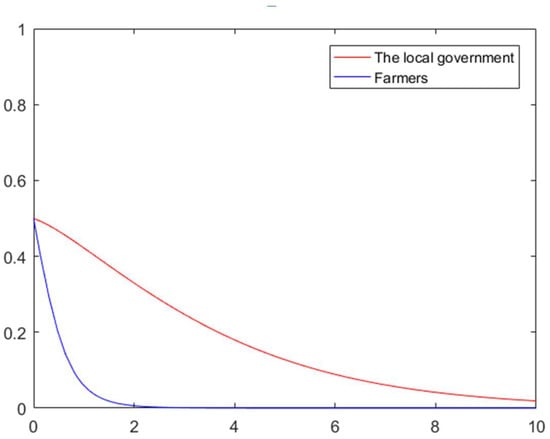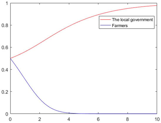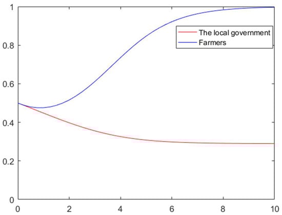 It can be seen in Figure 3 that when and , the local government tends to be compulsory and farmers tend to accept. Therefore, (compulsion, acceptance) is the evolutionary stable equilibrium point of the game. At this time, the “government rent-seeking” conflict occurs. The results show that although the threshold for farmers’ litigation has been lowered, when farmers’ litigation costs are high, farmers still choose to accept when facing disputes or suffer a loss of profits. The occurrence of the above situation not only weakens the social credibility of the law, but also makes it difficult to protect the legitimate rights and interests of farmers through legal channels. Given this, the simulation of reduced litigation costs of farmers to set with other assumptions remaining unaltered results in the following changes (Figure 4).