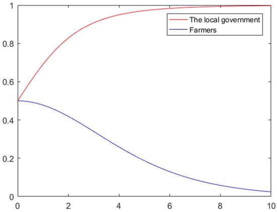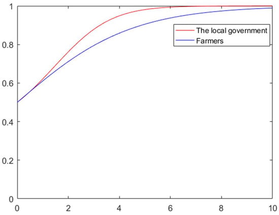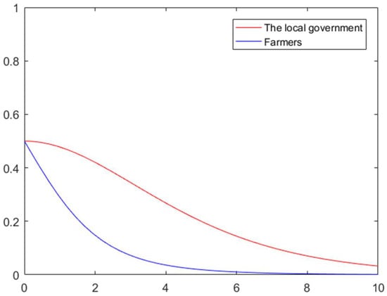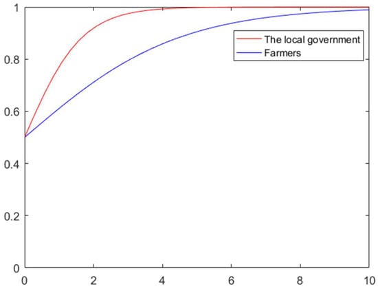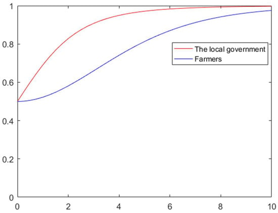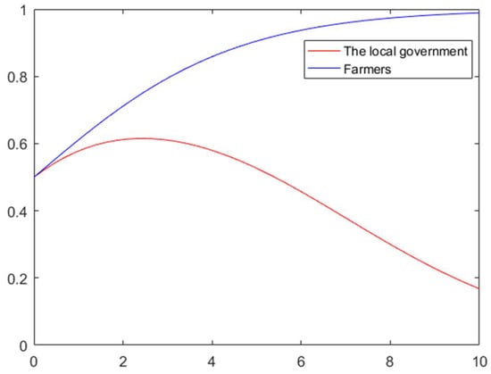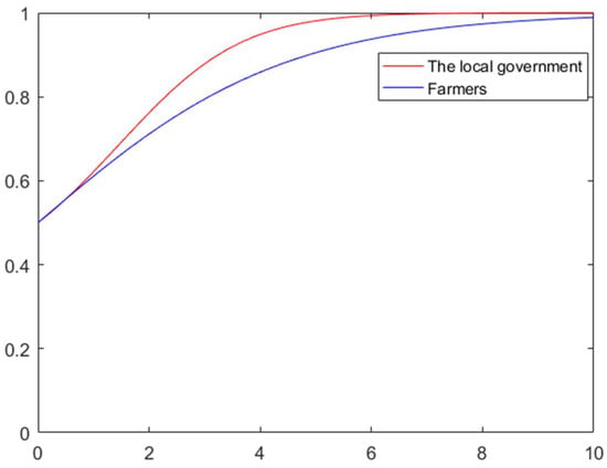 When the litigation conditions for farmland expropriation are significantly improved, it is relatively easy for farmers to protect their rights through the law, so farmers are more inclined to resolve disputes through litigation. According to Equations (4) and (8), the initial conditions are set as , , , , , , and ; the simulation results are shown in Figure 3.