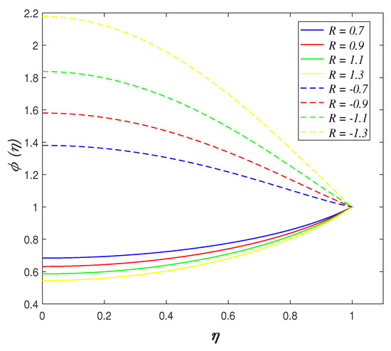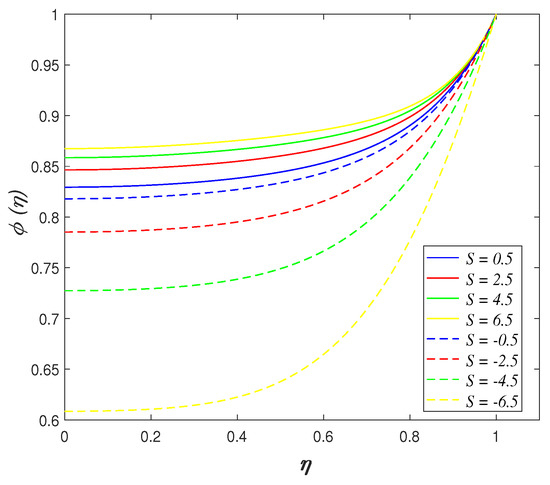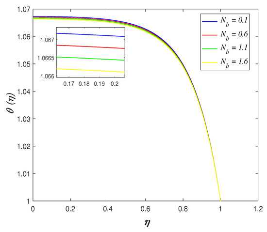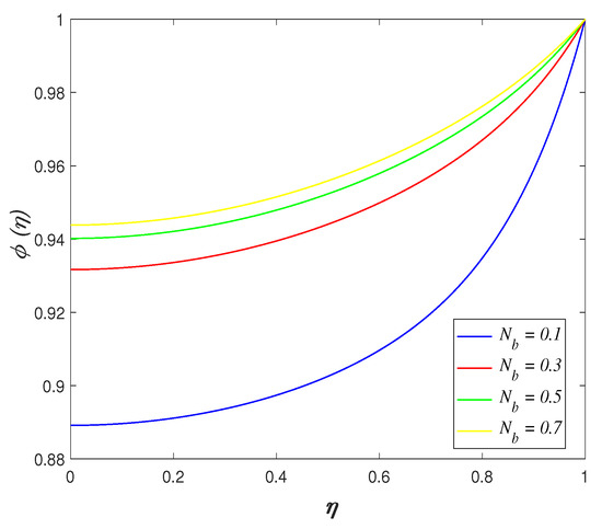 increases. Physically, the existence of Brownian motion enhances the kinetic energy of nanoparticles. The nanoparticles move from the upper wall to the flow region effectively and, thus, increase the concentration field. The influence of