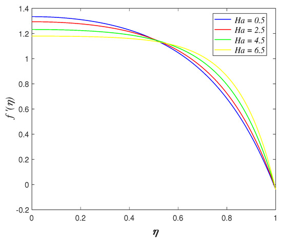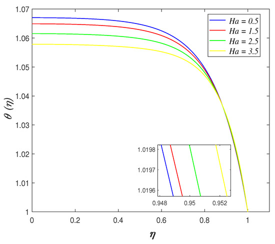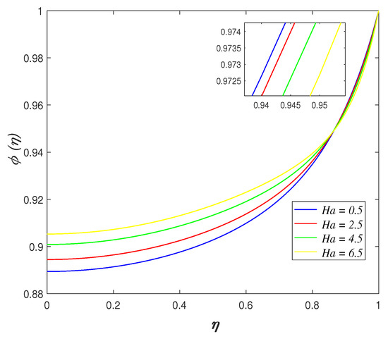Figure 13 describes the variation of Ha on nanoparticle concentration. The concentration profile rises on