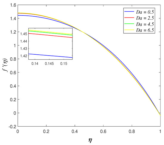 increases. The flow across porous medium accelerates with the rise of permeability of the porous medium. The impact of