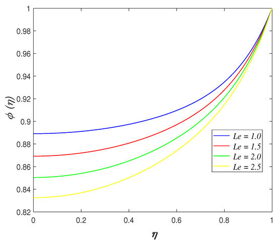 . It is stated that the Lewis number is inversely proportional to the Brownian motion. The motion of nanoparticles from the upper boundary to the flow region slows down as the Brownian motion decelerates. This phenomenon reduces the concentration in the fluid flow. The impacts of