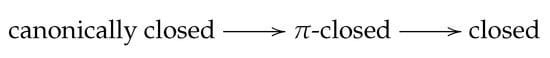 Let be the set and define as , , , , , , , . Here, the set is π-closed as it is the intersection of two canonically closed set i.e., and but is not canonically closed. In this Čech closure space, is closed but not π-closed as it is not equal to the intersection of two canonically closed set.