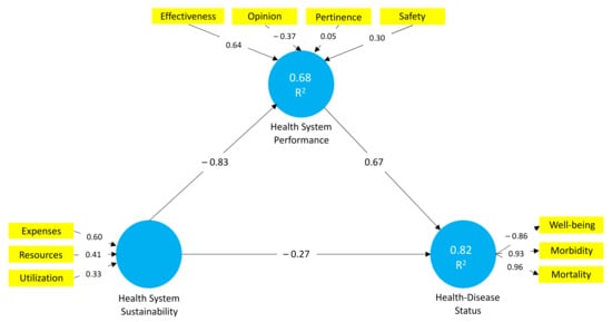 The second step: higher-order composites’ structural model. Health system sustainability, health system performance, and health–disease status are higher-order constructs (HOC).
