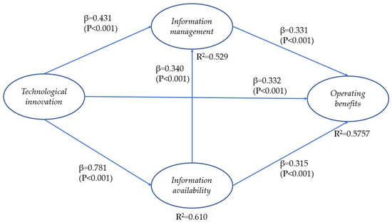 Table 8 illustrates the total effects among variables and the associated p-value. It is observed that all the total effects are statistically significant, even though one of the indirect effects was not. For example, the relationship between Technological innovation and Operating benefits has a total effect of β = 0.809 with p-value < 0.001, indicating a significant total effect between those variables. We observed that the indirect relationship between Information availability and Operating benefits was statistically non-significant, but the direct effect and total effects were significant.