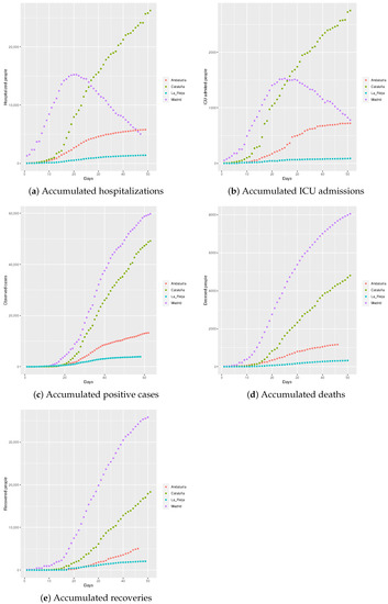 Discrete daily observations of accumulated positive cases, deaths, hospitalizations, ICU admissions and recoveries in Madrid, Andalucía, Cataluña and La Rioja.