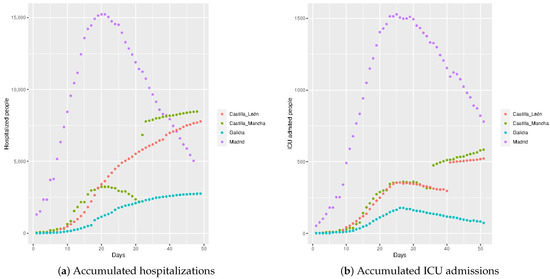Discrete daily observations of accumulated hospitalizations and ICU admissions in Madrid, Castilla La Mancha, Castilla León and Galicia.