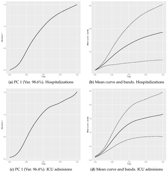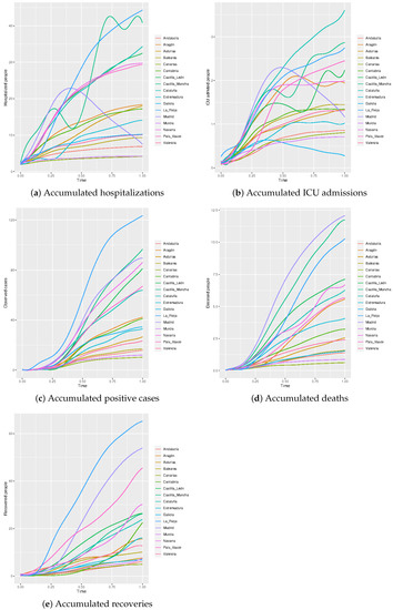 From this point, the time evolution of COVID-19 cases, deceases, recoveries, hospitalizations and ICU admission will be considered as functional variables that will be denoted as , , , and , respectively (the X-variables will be considered as predictors and the Y-variables as responses in the functional regression models). The observed data are the number of daily cumulative informed values of these five functional variables for the seventeen ACs in Spain from 20 February 2020 to 27 April 2020 (see data source (https://cnecovid.isciii.es/covid19/#documentacion-y-datos) (accessed on: 26 May 2021)). Then, a random sample of curves which are observed daily are available.