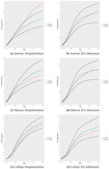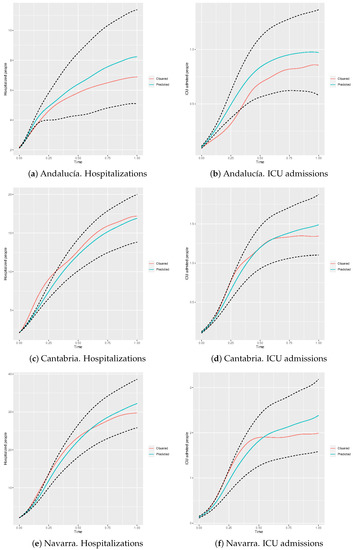Finally, the expected curves provided by the regression models in Equation (7) for hospitalizations and ICU admissions in the badly recorded ACs, next to their confidence bands and observed curves, are drawn in Figure 8 and Figure 9.