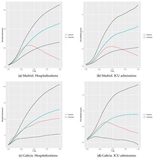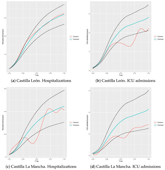 The obtained predictions can be considered as an imputation of the real behaviour of these curves in the observation period if the mode of data communication did not change. Thus, in Castilla La Mancha on 27 April 8464, people were reported as hospitalized and the imputation provided by the model is 9062 cases; in Castilla León, 7777 versus 7658; in Galicia, 2758 versus 3511; in Madrid, 5039 versus 30,587. For ICU admissions, the differences between the registered and imputed cases are, again, evident. It can be seen that, in Castilla La Mancha on 27 April, 584 people were registered as admitted in ICU and the model gives an estimation of 871; in Castilla León, 522 versus 674; in Galicia, 73 versus 236; in Madrid, 780 versus 3111.