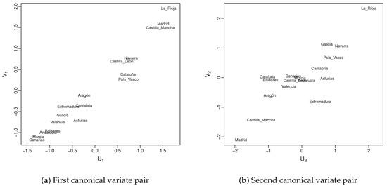 Note that the squared canonical correlations represent, for each pair, the percentage of variance in one canonical variate explained by the variation in the other one, but say nothing about the extent to which the canonical variates themselves account for variation in the original variables. Then, around 95.4% of the variation in the first canonical variate for HOR () is described by the variation in the first canonical variate for IR (), and almost 71% of the variation in is explained by . This fact suggests that both canonical correlations are important. Figure 10 displays how the values of the canonical variates are spread over the plane. The linear relation in each pair is clearly visible in these scatterplots. Likewise, it is possible to draw conclusions about which ACs behave similarly during the first wave. The results are in accordance with multiple studies about the COVID-19 pandemic in Spain (see, for example, [19]).