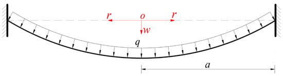 Here, denotes the so-called initial stress or pre-stress in the initially flat, plane-radially stretched or compressed circular membrane, and is the initial strain. Equations (22) and (23) indicate that the result of plane-radially stretching or compressing an initially flat, stress-free circular membrane is that the stress or strain in the plane-radially stretched or compressed circular membrane is uniformly distributed, i.e., at all points on the membrane the stress or strain is the same, especially the circumferential stress is equal to the radial stress and the circumferential strain is equal to the radial strain . Therefore, after the plane-radially stretched or compressed circular membrane is fixed at the edge of radius a, the membrane remains flat and has a uniform in-plane stress and strain . Thus, the boundary conditions for solving Equations (3), (4) and (12) can finally be written as