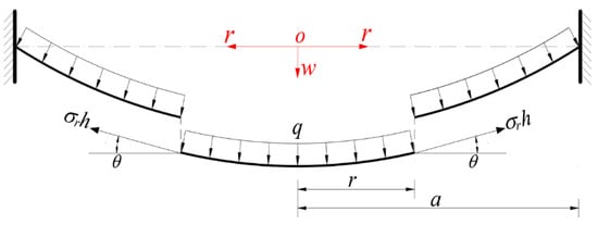 The geometric intermediate surface of the deflected pre-stressed circular membrane, which is endowed with all materials and their mechanical responses, is taken away a free body from its central portion, to study the static equilibrium problem of this free body under the joint action of the gas pressure q and the membrane force σrh acted on the boundary of the free body, just as it is shown in Figure 3, where σr denotes radial stress, h denotes the thickness of the membrane, and θ is the slope angle of the deflected pre-stressed circular membrane, which varies with radial coordinate r. Right here there are two vertical (transverse) forces whose direction is perpendicular to the polar coordinate plane, i.e., the total vertical force πr2q (0 ≤ r ≤ a) of the gas pressure q [] and the total vertical force 2πrσrhsinθ that is produced by the membrane force σrh. Therefore, from the condition of the resultant force being zero at the direction perpendicular to the polar coordinate plane we may have