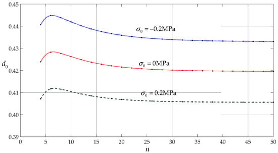 The obtained numerical values of the undetermined constants and under different parameter n and pre-stress σ0 are listed in Table 1 and Table 2. It may be seen, from Table 1 and Table 2, that the difference between the numerical values of or , which are obtained with n = 48 and n = 50, is very small. Their convergence trend is shown in Figure 4 and Figure 5. It may be seen, from Figure 4 or Figure 5, that as the parameter n is increased, the data sequence for converge rapidly to the theoretical values (unknown exact values) of the undetermined constants or , whereas the data sequence for converge relatively slowly, and the convergence rate of the data sequence for is the slowest of the three cases. This means that the pre-stress has an effect on the convergence rate. Meanwhile, it may also be seen, from Figure 4 or Figure 5, that the pre-stress also has an effect on the size of the unknown exact values of the undetermined constants and , that is, it affects the determination of the theoretical values of the undetermined constants and .