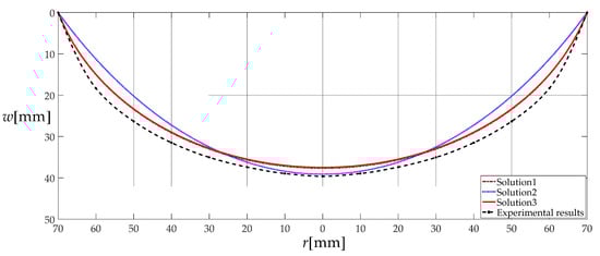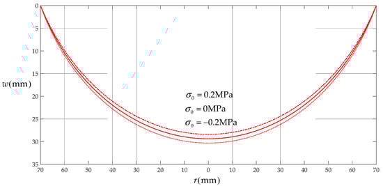 From the derivation of the boundary conditions in Section 2, it may be seen that the derived boundary conditions, Equations (24)–(26), can be called universal boundary conditions, because the case of in Equation (25) corresponds to the circular membrane without pre-stress, corresponds to the circular membrane with tensile pre-stress, and corresponds to the circular membrane with compressive pre-stress. Therefore, the closed-form solution obtained in Section 2 can be applied to the case where the initially flat circular membrane may or may not have a uniform in-plane stress before deflection, and the in-plane stress can be either tensile or compressive.