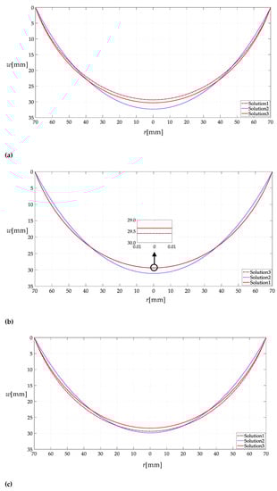 From Figure 8b and Figure 9b, it may be seen that when the deflection or stress curve by solution 3 (which is presented by this paper) basically coincides with the curve by solution 1 (which is presented by Fichter []). This proves to some extent that the process of solving in Section 2 of this paper is correct and the closed-form solution presented is reliable, because solution 3 should be returned to solution 1 when the pre-stress is equal to zero. However, it may also be seen from Figure 8 and Figure 9 that the deflection and stress curves by solution 2 (which is presented by Campbell []) are far from the curves by solution 1 or 3, especially the stress curve (the maximum relative error of solution 2 to solution 1 or 3 is about 25% for , 24% for and 23% for ). This means that if solution 1 is reliable, then solution 3 should also be reliable, and therefore solution 2 must be unreliable.