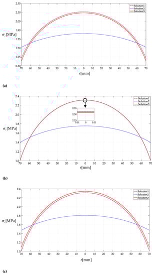 Now, let us show the difference between the solution presented in this paper and the solutions presented by Fichter [] and Campbell []. Figure 8 and Figure 9 show the variations of the deflection and radial stress with the radius r, where the solution 1 refers to the solution presented by Fichter [], the solution 2 refers to the solution presented by Campbell [], and the solution 3 refers to the solution presented in this paper.