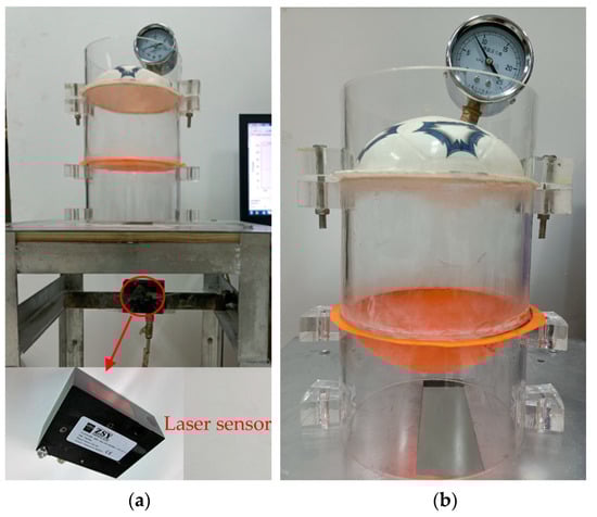 Now, let us consider a simple experiment to test the accuracy of the solutions presented by Fichter [], Campbell [] and this paper. An initially flat stress-free circular natural latex thin film with Young’s modulus of elasticity E = 0.941 MPa, Poisson’s ratio , thickness h = 0.8, and radius a = 70 mm is subjected to the action of gas pressure q = 0.008 MPa, as shown in Figure 10. A non-contact laser displacement sensor (ZSY Group Ltd., London, UK) is employed to measure the membrane deflection. The measured membrane deflection along the radius of the circular membrane is shown in Figure 11, where solution 1 refers to the solution presented by Fichter [], solution 2 by Campbell [], and solution 3 by this paper. From Figure 11, it may be seen that within r = 20 mm the Campbell’s solution outperforms the solutions presented by Fichter [] and by this paper, but it becomes worse and worse as r becomes bigger, especially on the scale of r = 40–60 mm. This is because the Campbell’s solution uses Hencky’s in-plane equilibrium equation [,], thus neglecting the horizontal component of the applied gas pressure q, performing poorly on both sides. Table 3 shows the measured and calculated results of deflection and the relative errors of calculation to measurement. It may be seen from Figure 11 or Table 3 that the overall effect of the closed-form solution presented in this paper is better than that of Campbell’s solution [].
