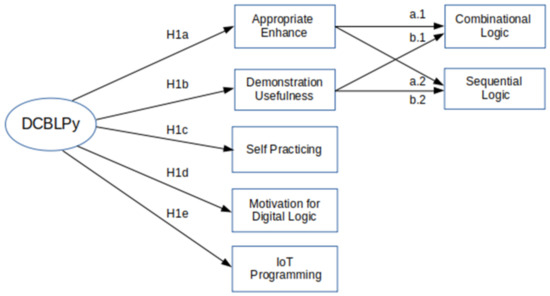 There has been a decision made to determine whether DCBLPy (a.k.a. DCBLP discourse application)—as an important control variable—has a positive/negative impact on the students during the training, before the cognitive performance of the students is measured. The questionnaire was prepared to fulfil this goal. There are 11 questions in the questionnaire used in this research (of a total of 20) divided into several categories corresponding to the proposed hypothesis: “Appropriate enhancement” means how the students sense the way DCBLPy is used during the education and whether it helps to enhance the education content or whether it brings additional unwanted/inappropriate load. “Demonstration”—should uncover whether transforming logic areas and algebra formulas into programming code of DCBLPy and demonstrating DCBLPy instead can be seen from the perspective of the students as helpful. “Practicing” means utilization and use of DCBLPy by the students themselves and their expectation regarding the necessity for practicing at school during the training, which is currently not possible because of the allowed educational form. “Motivation for Digital Logic” expresses whether DCBLPy motivates the students to even think by themselves about the Boolean logic functions and Boolean logic based tasks—and if so, in which part of the curriculum. “IoT programming” represents the students’ opinion about future IoT programming using DCBLPy. Data gathered from the “Enhancement”, “Demonstration” and partially from other areas can be additionally observed from the combinational and sequential logic perspective. Because the research in this part covers the students’ affect area, it can be later enhanced/reduced to more/less categories. Additional hypotheses can also be formulated during future research. The main categories covered by the questionnaire in relation to hypotheses H1x for the affective area (described in the text above) are visualized in Figure 3.
