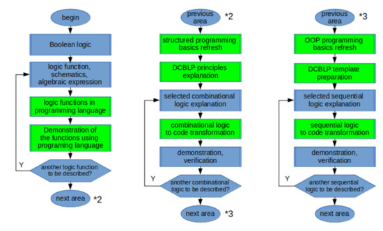 Each of the areas enhanced by DCBLP and mentioned in Table 3 can be observed in more details to understand the impact on the curriculum. This part explains how the training content in the area of logic functions, combinational logic and sequential logic can be enhanced by programming based on DCBLP. Flow-charts for each of mentioned areas impacted by DCBLP are available in Figure 5. Please note the areas that are not impacted (as presented also in the Table 3, e.g., rules, logic levels) are not discussed in detail as the training content is not modified compared to standard training in the control group. The goal is to use something the students already know—programming language, to describe something they learn and try to understand—the logic. It is expected to directly practice the logic, fixing the knowledge and observe the final result. Moreover, the students learn how to enhance the programming code, use inheritance and build more complex solutions based on previously assembled code. They will be thinking about the solution within the Boolean logic and permitted operators’ boundaries.