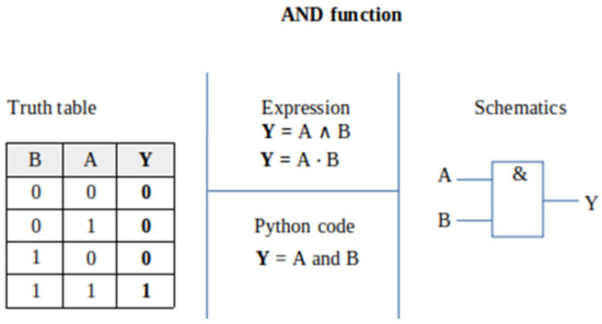 An example of DCBLPy usage is presented in Figure 2 to support the presented principles and the background theory. It illustrates a simple digital logic comparator (identity, not magnitude) which can also be found as the digital circuit in TTL logic (74 × 521 or similar). It belongs to the combinational logic area. The logic of such a comparator can be transformed to Python code (Figure 2-bottom part of the picture) that follow the rules of DCBLP. Only Boolean logic operators are accepted and loop block is allowed. There is no need for an “if statement” at all. Note that the code is simplified and does not contain inputs validation and handling of exceptions. The magnitude compactor can also be created.