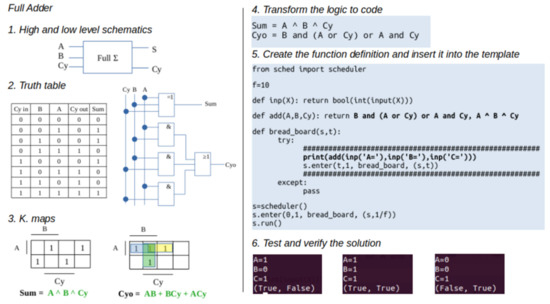 It is not so hard to educate IT oriented students in the area of Boolean logic, Boolean algebra and normal forms, but it is much harder to educate them in the rest of the proposed areas. Those are supported by the electronics and digital integrated circuits principles which are not in the scope of an IT education program as mentioned previously. There is the possibility of simply excluding these areas from the curriculum but it is more meaningful to support these digital logic areas differently than for electronics. It is also already known that the declarative logic programming utilizing PROLOG is an appropriate way of describing the functions of digital logic circuits [11]. Clocksin began the research for two main reasons: to develop logic-programming idioms, evaluating the relative utility of various techniques, and to demonstrate how logic programming can contribute effectively to design automation for digital circuits. There is also a Computer Science (CS) curriculum in Israel enhanced by the logic paradigm programming [12]). The goal of Gal-Ezer was to enhance formal logic education at high schools. Thanks to this enhancement, the students in Israel are trained in imperative and declarative programming paradigms (separately). Noticeable are also the intentions to focus on the constructivist learning method in the formal logic area [13,14,15]. An overall summary of the milestones related to Mathematical Logic in Computer Science is presented by Kfoury [16,17]. There are also other non-procedural paradigm based experiments in teaching theoretical computer science [18]. Based on these facts and previous findings regarding digital logic and programming, it is possible to assume that an appropriate programming solution can possibly enhance digital logic training. An appropriate programming solution should help IT students to better understand the areas of digital logic that are normally related to electronics. The solution could also bring the possibility of substituting electronics parts by an equal software oriented portion supporting demonstration and practicing. However, the goal is not just to include another programming paradigm into curriculum, but to use the best of the imperative paradigm (which is already mandatory and included in the IT curriculum) and declarative paradigms (it is not included as mandatory in the IT curriculum) in one solution. Surely the automata-based or already mentioned HDL programming—such as Python based FHDL [19]—can be used to support the intention, but we would like to know whether using the logic programming (as Clocksin did using PROLOG) together with imperative programming would also be beneficial. The reason is that, nowadays, programming languages offer more possibilities than 30 years ago and there certainly exists the possibility to merge some of the standalone paradigms to one programming solution. An example is the recently developed programming discourse utilizing multi-paradigm principles to support digital logic education using any current programming language that can follow the rules of this new discourse. The solution is purely based on Boolean logic without the necessity of using supportive constructions and statements that are not necessary to describe the logic. It directly transfers the principles of Boolean logic and Boolean algebra into the programming one to one as they can also be seen this way in real digital circuits made of semiconductors (the logic way, not automata-based), no matter whether we are speaking about the combinational or the sequential ones. It also emphasises the Flow-Based Programming principles [20], which belongs to the declarative paradigm [21]. The mentioned selected programming discourse is named Digital Circuits Based Logical Programming (DCBLP). Its principles are applicable for several programming languages that are nowadays widely used, such as Java, C++ and Python. The Python programming language has been chosen as the primary language in this experiment due to its rising popularity [22]. It can be easily used on desktop computers running many of the common operating systems as well as on Internet of Things (IoT) devices driven by Linux based operating systems. DCBLP discourse applied in Python programming language is called DCBLPy by the authors. The prerequisite necessary for the students to use DCBLP is to understand the basic principles of the programming language chosen as the platform to apply DCBLP (such as Python). It can be performed and implemented as suggested by the roadmap in Figure 1. An experiment described in this article focused on stage 2, presented in Figure 1.