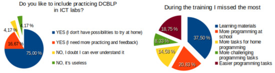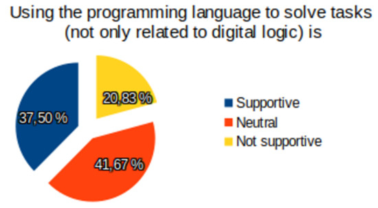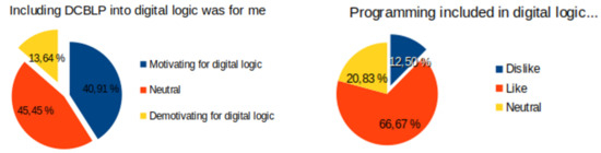 The questionnaires investigating the students’ opinions were filled out after 9 months of the training (almost at the end of the course–1 month left) by the participants of the experimental group only, as they contained the questions related to the new educational content, which was unknown to the students of the control group. Of the 28 students contacted, 24 (86%) attended the survey. The knowledge in the digital logic area was measured by the achievement test after 10 months from the beginning of the training (one month left to end of the course) in both groups. The test was used as the last countable exam of the course in both groups. Even if the control group did not participate in the education of the modified training content, they had the same previous programming language training as the students in the experimental group. The part of the test directly dealing with the DCBLPy code (only one question) was not measured in the control group. The programming questions/tasks dealing with the opened answers were measured in both groups as the control group could use standard programming language Python syntax to express an acceptable solution. Time taken to fill the test was 45 min (one education unit). All of the students (100%) in both groups participated. No student missed the test.