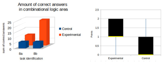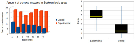 Because of the different count of participants, the data cannot be directly compared by simple calculation and visualization of the amount (frequency) of correct answers. Therefore, this comparison (Figure 16-left) is only illustrative. Better results comparison brings box-plots (quartile based graphs: Figure 16-right). The experimental group , the lowest gained points is 1.5 and the highest points gained is 7. For the control group , the lowest points gained equal 0, the highest points gained = 7. Maximum possible points that could be gained by each students for this part = 7.