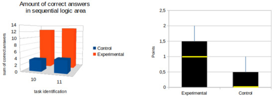 An achievement test explores the cognitive aspects of DCBLP(y) inheritance into the training along with the other control variables set. The test contains 16 tasks with 1 point per task (16 points in total). The test was divided into several categories that should provide data for hypothesis H2 verification (transformed to statistical hypothesis H0 and alternatives). Categories in the test directly copy the need to answer the null and alternative hypotheses, respectively. Boolean logic and functions (7 questions), combinational (2 questions) and sequential logic (2 questions) knowledge could be tested. Additionally, programming skills covering all previous categories based on DCBLP principles were measured (5 questions: 1 covering Boolean logic, 3 combinational, 1 sequential). All of the areas contain open-ended questions; there is no close-ended question. At least one question of each category was focused on the lower levels of the Bloom’s taxonomy of cognitive aims (remember or understanding) and at least one question was focused on application. This test was also used during the proof of concept (pilot) stage and adjusted accordingly afterwards. Discrepant criteria were calculated to eliminate the easiest questions. Based on the initial results (in pilot), it was possible to express that the Upper-Lower Index was between 0–0.5 (neutral to slightly difficult) and the Kudera-Richardson’s reliability coefficient [29,31] was 0.78 (acceptable reliability). The validity of the test was assured and acquired by the peer review.