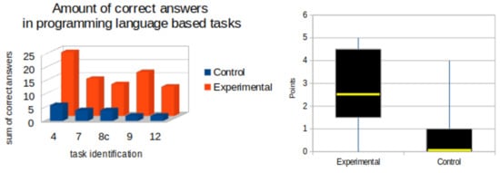 All tasks/questions require the usage of a programming language. There was no necessity to use DCBLP in the answers for the question as the control group students have had no training in this new programming discourse. Although both groups went through previous training in the programming language (see Figure 1 stage 1). Every piece of code using any programming language and leading to a task’s solution was acceptable. The graph on the left side of Figure 19 shows the frequency (sum amount) of acceptable solutions per task, on the right are the quartile graphs for groups’ comparison. The experimental group , the lowest gained points = 0 and the highest points gained = 5. For the control group , the lowest points gained equal 0, the highest points gained = 4. Maximum possible points that could be gained by each students for this part = 5. Graphs for this part are available in Figure 19.